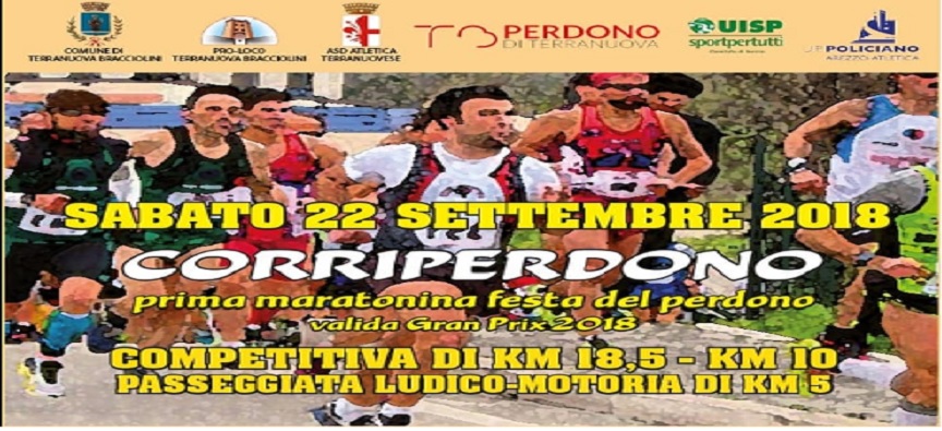 In occasione della Festa del Perdono, il Comune di Terranuova Bracciolini e la Proloco, in collaborazione con l’Atletica Terranuovese e la U.P. Policiano, organizzano per sabato 22 settembre la prima edizione di “Corriperdono” la gara podistica agonistica di 10 km e 18,5 km e non competitiva di 5 km.