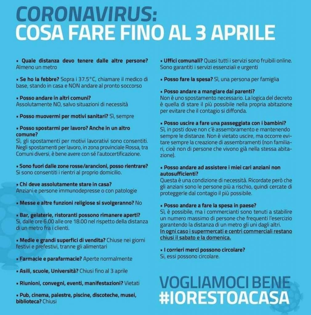 Nell’immagine allegata sono riportate le sintesi dei comportamenti da tenere evidenziati dalla normativa secondo la campagna lanciata dal Presidente del Consiglio #iorestoacasa