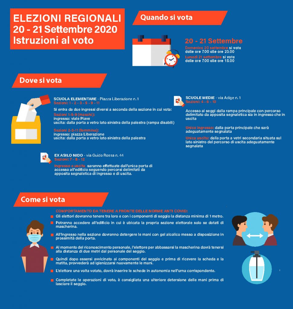 È previsto il contingentamento degli ingressi degli elettori per evitare assembramenti, il controllo sarà effettuato da personale apposito collocato agli ingressi degli edifici sede di seggio. Si ricorda ai cittadini che dovranno tenere comportamenti corretti volti ad evitare il contagio da Covid-19 come: mantenere la distanza minima di 1 metro tra loro e con i componenti di seggio e accedere all’edificio in cui è ubicata la propria sezione elettorale solo se dotati di mascherina. All’ingresso nella sezione sarà necessario detergersi le mani con gel alcolico collocato in prossimità della porta. Al momento del riconoscimento, inoltre, l’elettore per abbassarsi la mascherina dovrà tenersi alla distanza di due metri dal personale del seggio. Quindi dopo essersi avvicinato ai componenti del seggio e prima di ricevere scheda e matita, provvederà ad igienizzarsi nuovamente le mani. Una volta votato, dovrà inserire le schede in autonomia nell’urna corrispondente. Completate le operazioni di voto, è consigliata una ulteriore detersione delle mani prima di lasciare il seggio. Saranno inoltre previsti percorsi dedicati e comunque distinti di INGRESSO e di USCITA identificati con apposita segnaletica. In particolare: