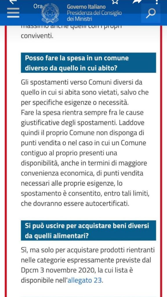 Riportiamo il chiarimento del Governo sulla possibilità di spostarsi per fare la spesa in base alle nuove disposizioni riguardanti la nostra Regione in vigore dal 15 novembre: “…Laddove quindi il proprio Comune non disponga di punti vendita o nel caso in cui un Comune contiguo al proprio presenti una disponibilità, anche in termini di maggiore convenienza economica, di punti vendita necessari alle proprie esigenze, lo spostamento è consentito”