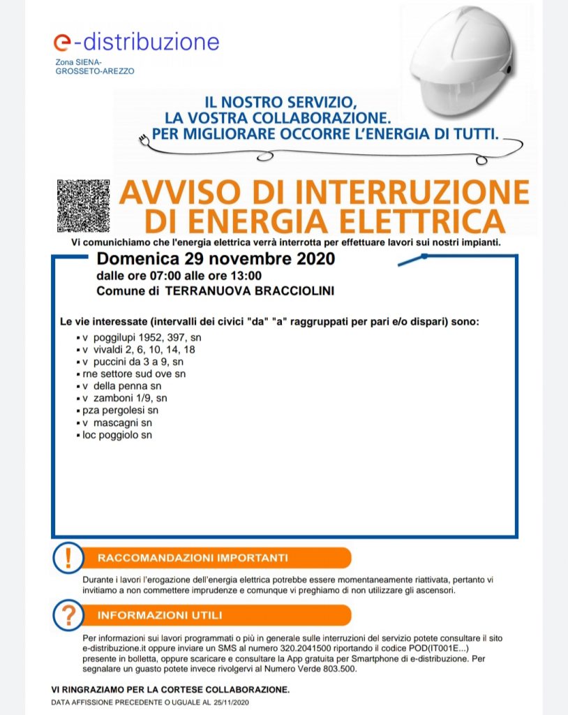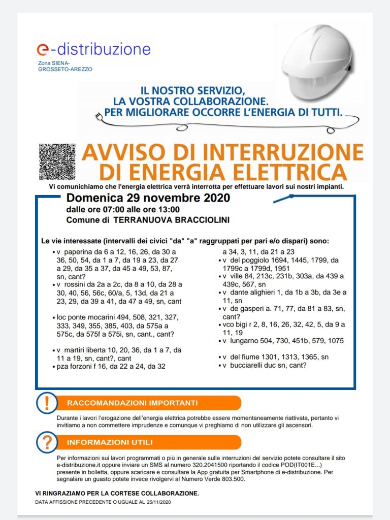 E-Distribuzione ha programmato questa attività eccezionalmente di domenica, per non creare disagi alle attività operative nei giorni feriali. Domenica 29 novembre l’esecuzione delle operazioni in sicurezza richiede il “fuori servizio programmato” di alcune linee di bassa e media tensione, a partire dalle ore 7:00 con conclusione entro la mattina. E-Distribuzione, grazie a bypass da linee di riserva, circoscriverà le aree di interruzione a gruppi ristretti di utenze. Le vie interessate dall’interruzione sono descritte nel volantino allegato.