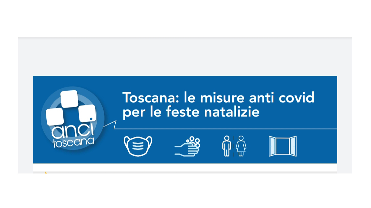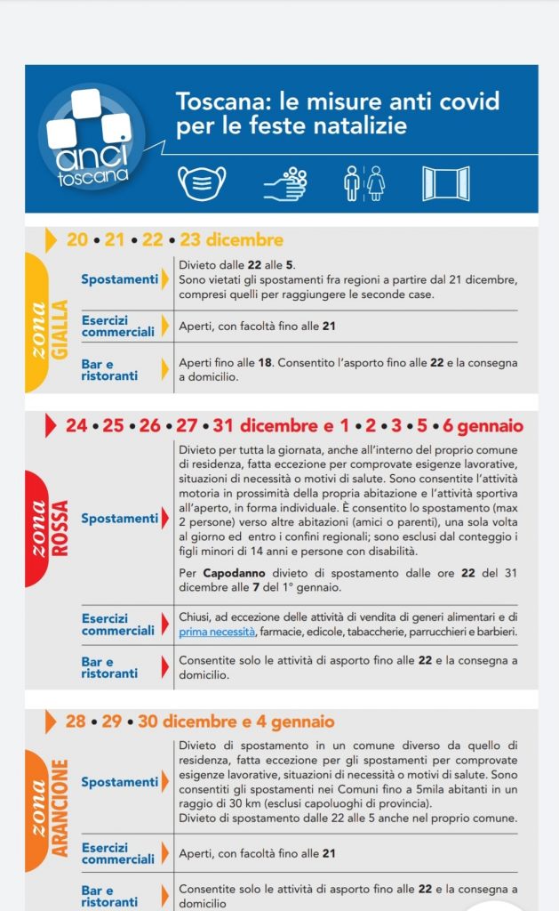 In base all’ultimo decreto legge n.172 del 18 dicembre 2020 riportiamo una sintesi, curata da Anci Toscana, delle misure in vigore nella nostra Regione a partire da domani 20 dicembre 2020 e valide fino al 6 gennaio 2021. Sul sito di Anci Toscana è possibile approfondire quali saranno gli esercizi che rimarranno aperti anche in zona rossa. Riportiamo il link: