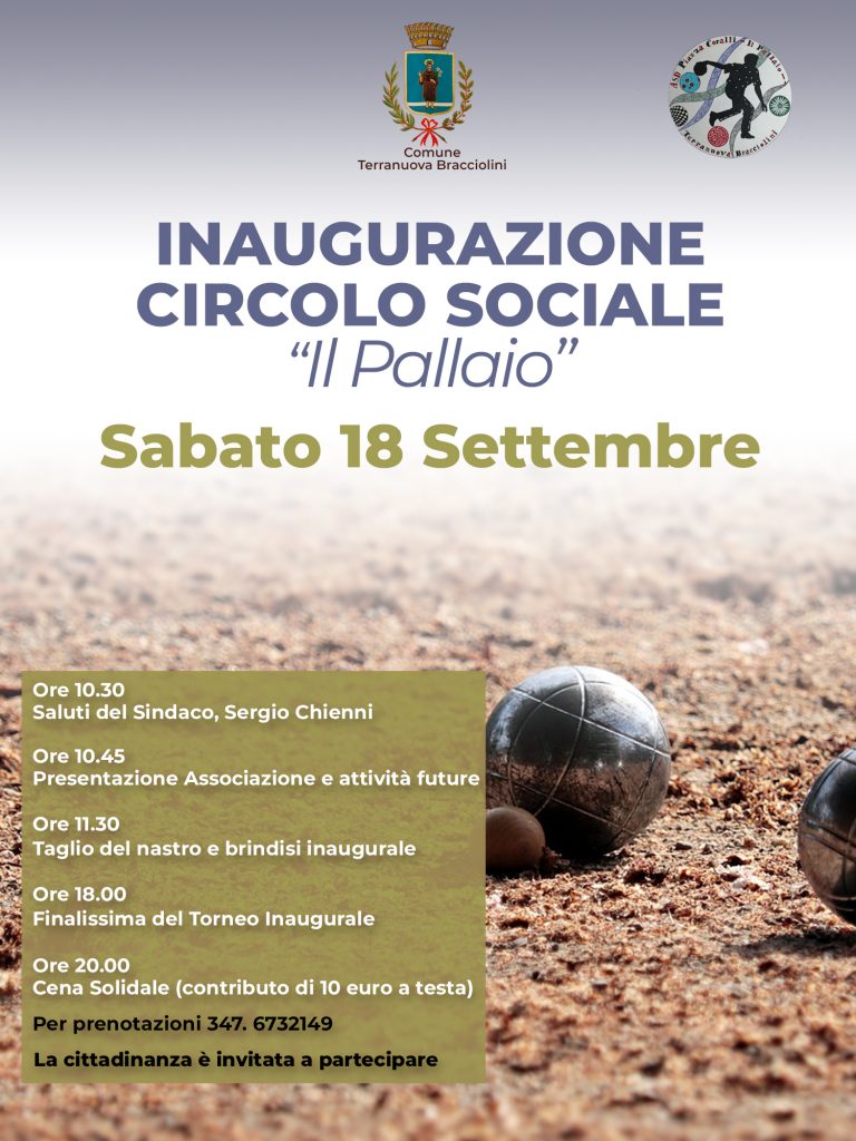 Sarà inaugurato sabato 18 settembre il nuovo circolo sociale Il Pallaio. Dopo i saluti del Sindaco (ore 10.30), sarà presentata la neonata associazione ASD Piazza Coralli e tutte le attività in programma per la prossima stagione.