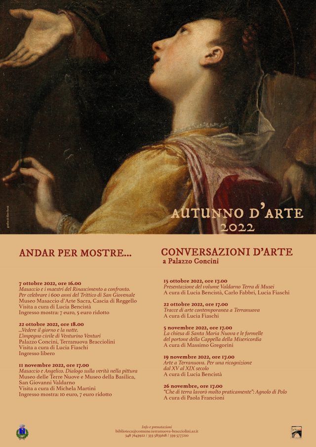 Un progetto che si articola tra le conversazioni d’arte a Palazzo Concini e le mostre dedicate a Masaccio (Masaccio e i maestri del Rinascimento a confronto a Cascia di Reggello e Masaccio e Angelico. Dialogo sulla verità nella pittura a San Giovanni Valdarno) e a Venturino Venturi (Vedere il giorno e la notte. L’impegno civile di Venturino Venturi a Terranuova Bracciolini).