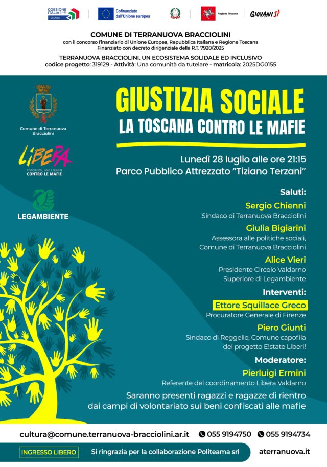 La serata, dal titolo “La giustizia sociale – la Toscana contro le mafie”, è promossa dal Comune di Terranuova Bracciolini, dal Coordinamento del Valdarno di Libera e dal Circolo del Valdarno di Legambiente, all’interno di un progetto sulla coesione sociale e sulla legalità finanziato dalla Regione Toscana.
