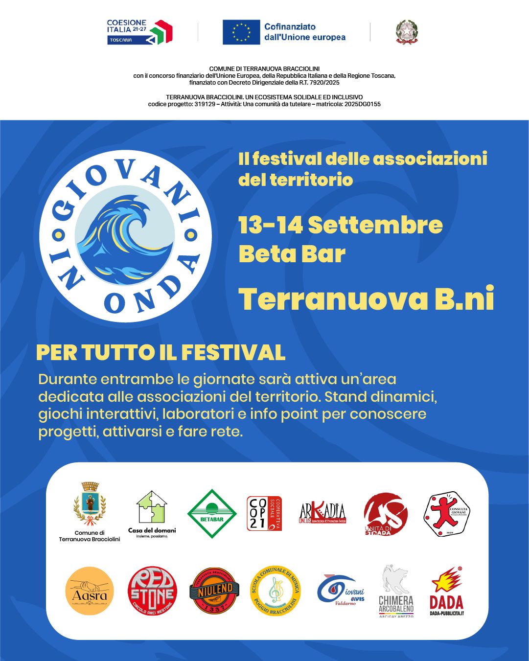 Associazioni coinvolte: Beta Bar, Casa del Domani, Arkadia, Coop21+ Operativa di Strada, Consulta Giovanile, Niulend, Scuola di Musica Comunale “Poggio Bracciolini”, Avis Giovani, Aasra (associazione di ragazzi di origine indiana), Circolo Arci Restonese, Chimera Arci Gay Arcobaleno.