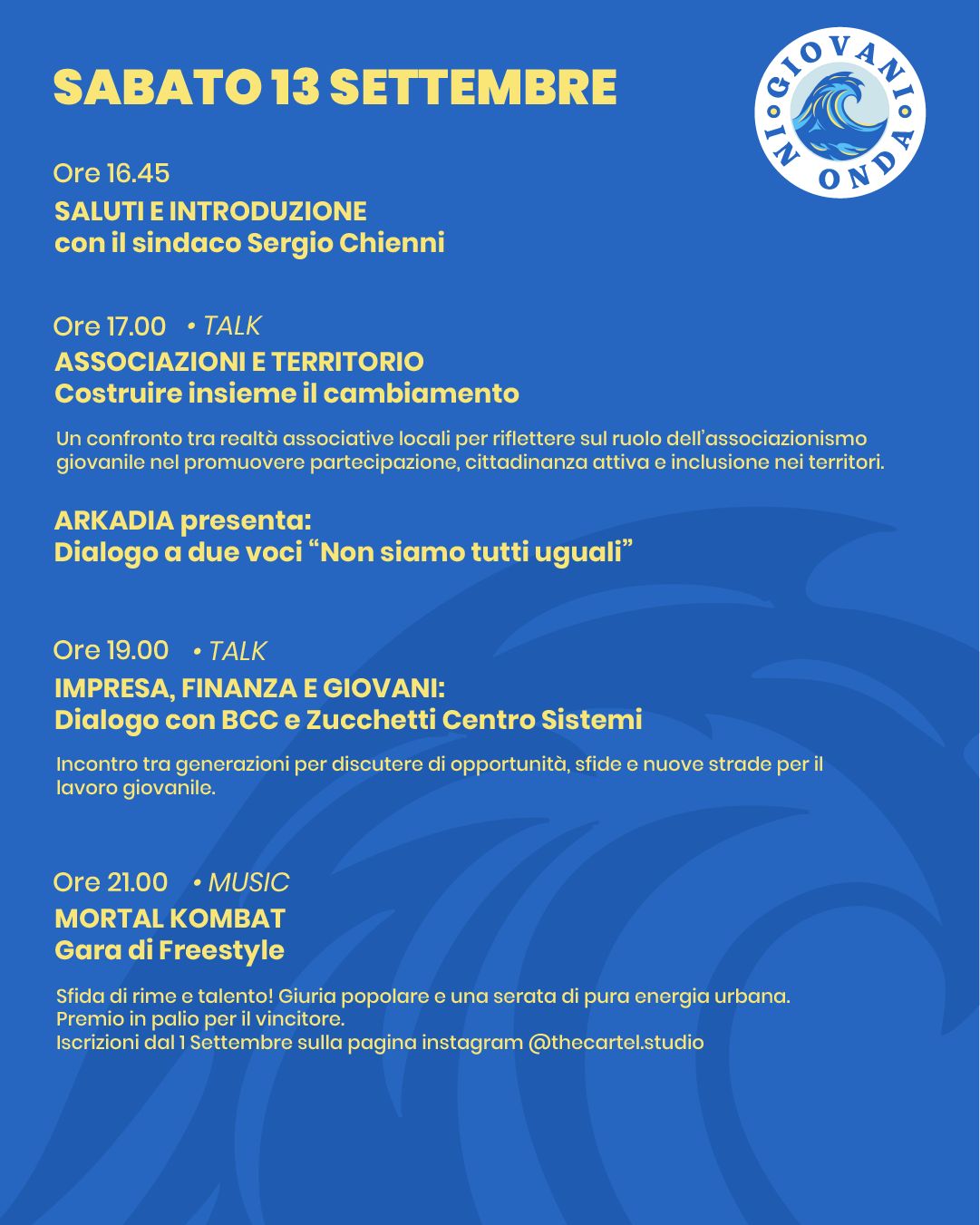 Il programma prevede nel pomeriggio talk e momenti di confronto su varie tematiche sociali e culturali, con la partecipazione di associazioni e professionisti del Valdarno, la sera musica e spettacoli.