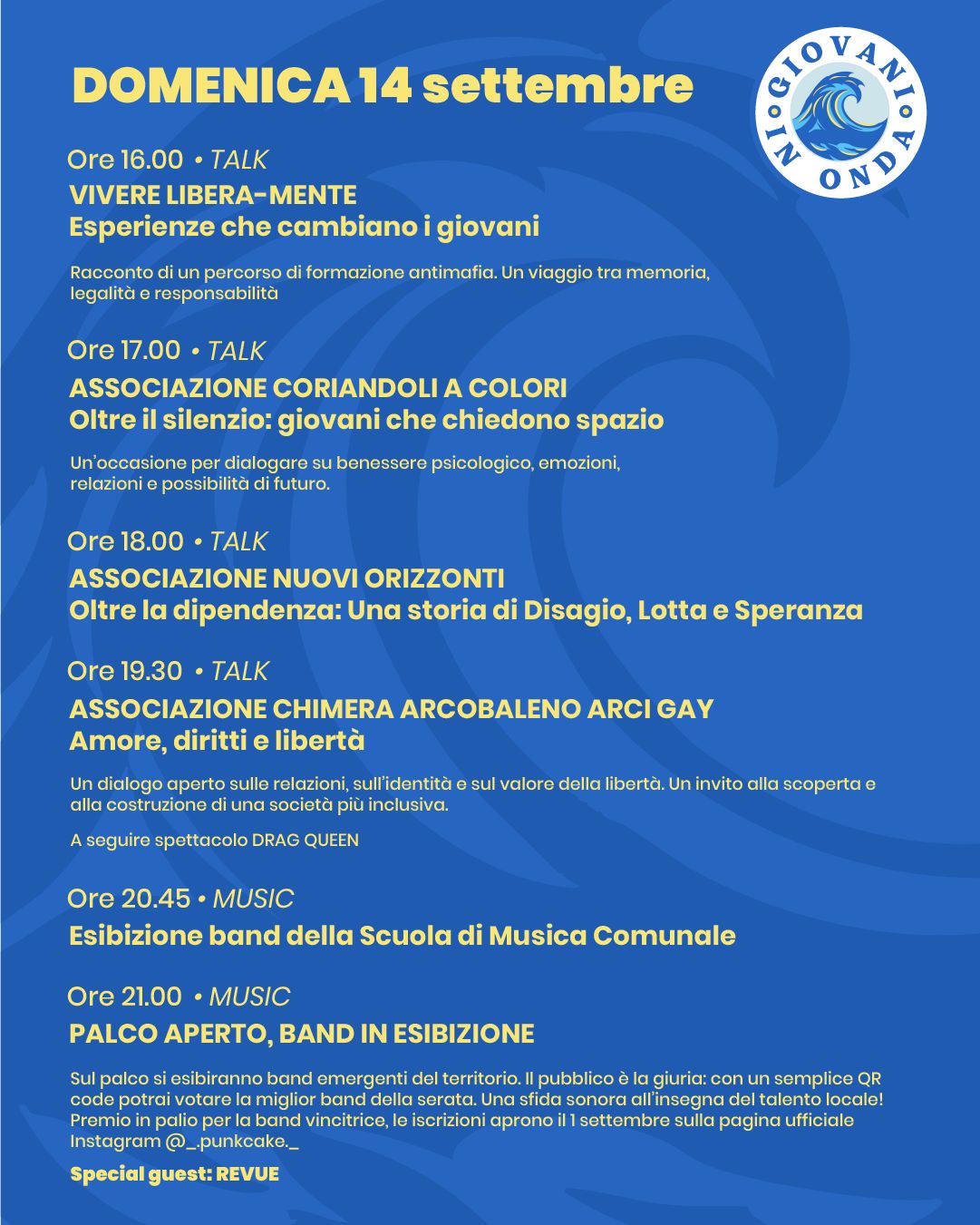 Sabato serata dedicata ad una gara di freestyle; domenica sul palco i ragazzi della Scuola di Musica Comunale “Poggio Bracciolini”, seguiti da band emergenti del territorio e, in chiusura, il concerto dei Revue.