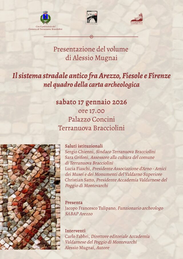 “Desidero esprimere le mie più vive congratulazioni ad Alessio Mugnai per questa pubblicazione di grande valore scientifico e divulgativo – ha detto l’assessora alla cultura, Sara Grifoni – che rappresenta un contributo solido e duraturo alla conoscenza del nostro territorio e delle sue radici più profonde. Il sistema stradale antico fra Arezzo, Fiesole e Firenze restituisce, con rigore e chiarezza, un quadro complesso e affascinante della viabilità etrusco-romana del Valdarno superiore, inserendola in una preziosa carta archeologica capace di parlare non solo agli studiosi ma anche alla comunità. Un ringraziamento particolare va all’Accademia del Poggio e all’associazione D’Arno, che da anni svolgono un lavoro attento e appassionato nella cura e nella valorizzazione degli aspetti storici e culturali della nostra terra. Attraverso iniziative come questa riscopriamo antiche bellezze per custodire la memoria del passato, rendendola viva e accessibile”.