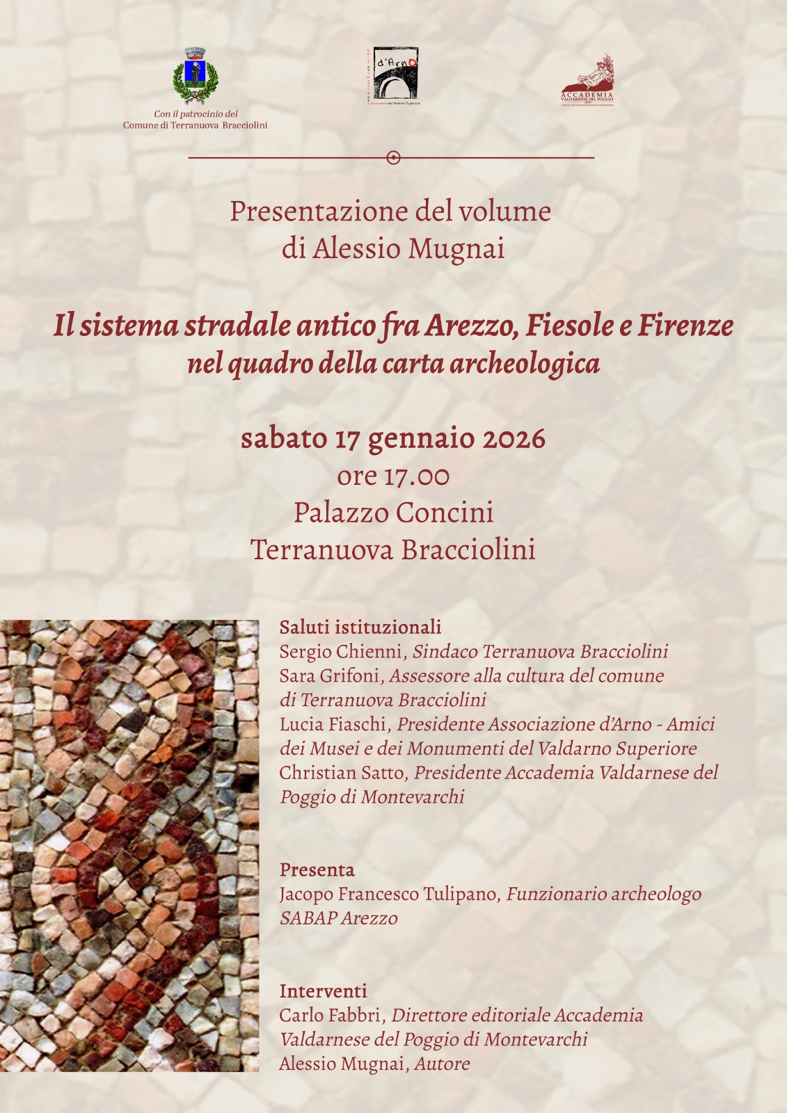 Dopo i saluti dell’Accademia e dell’Associazione “D’Arno – Amici dei Musei e dei Monumenti del Valdarno Superiore”, interverranno Jacopo Francesco Tulipano (Funzionario archeologo presso la Soprintendenza Archeologia Belle Arti e Paesaggio di Siena-Grosseto-Arezzo) e l’autore.