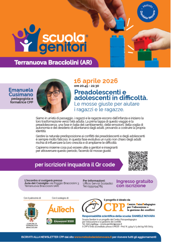 A guidare la serata sarà la pedagogista e formatrice Emanuela Cusimano, nell’ambito del progetto “Scuola Genitori” promosso dal Centro Psicopedagogico per l’educazione e la gestione dei conflitti, con la responsabilità scientifica di Daniele Novara.