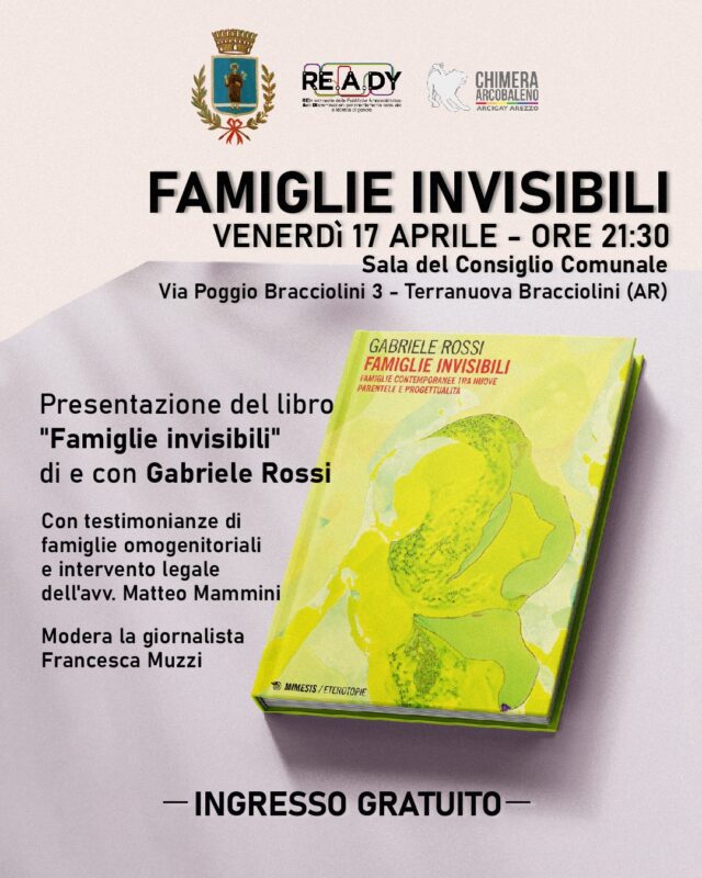 Nel corso della serata interverranno il ricercatore e autore Gabriele Rossi, con il volume “Famiglie invisibili. Famiglie contemporanee tra nuove parentele e progettualità”, l’avvocato Matteo Mammini, esperto legale e referente toscano di Rete Lenford – Avvocatura per i diritti LGBTI+, e saranno inoltre previste testimonianze dirette di genitori same-sex che racconteranno i propri percorsi familiari e personali.