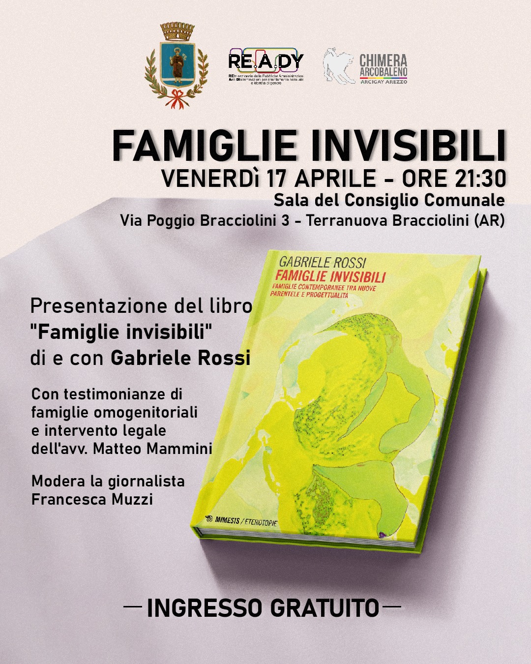Venerdì 17 aprile alle ore 21.30 la Sala del Consiglio ospiterà un incontro pubblico di approfondimento dedicato alle famiglie omogenitoriali, promosso dal Comune di Terranuova Bracciolini nell’ambito della rete Re.A.Dy, in collaborazione con Arcigay Arezzo Chimera Arcobaleno.