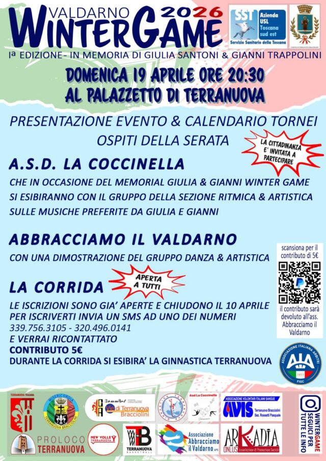 Una serata per ricordare, condividere e costruire comunità attraverso lo sport. Sarà questo lo spirito che animerà domenica 19 aprile, a partire dalle 21, il Palazzetto di Terranuova Bracciolini, in occasione dell’apertura ufficiale del “Valdarno Winter Game 2026”, prima edizione del memorial dedicato a Giulia Santoni e Gianni Trappolini, operatori della Misericordia di Terranuova Bracciolini morti mentre erano in servizio in ambulanza nell’agosto del 2025. Ospite dellaLa serata inaugurale sarà la Società Ginnastica Terranuova che farà una breve esibizione.