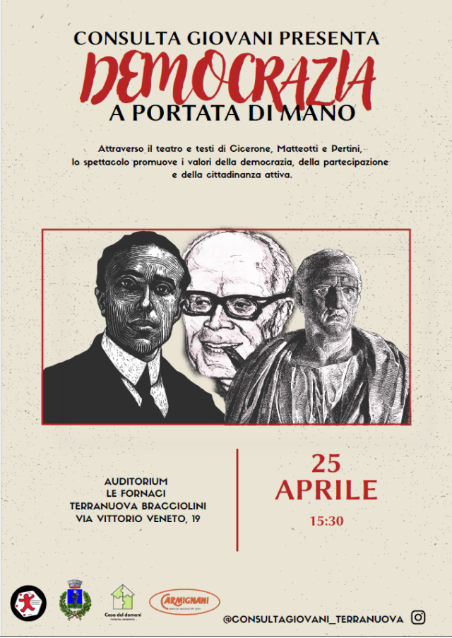 Un’iniziativa che unisce teatro, storia e riflessione civile per celebrare il 25 aprile e ribadire il valore della partecipazione democratica, soprattutto tra le nuove generazioni. È questo lo spirito di “Democrazia a portata di mano”, l’evento organizzato dalla Consulta Giovani di Terranuova Bracciolini, in programma il 25 aprile alle ore 15.30 all’auditorium Le Fornaci.